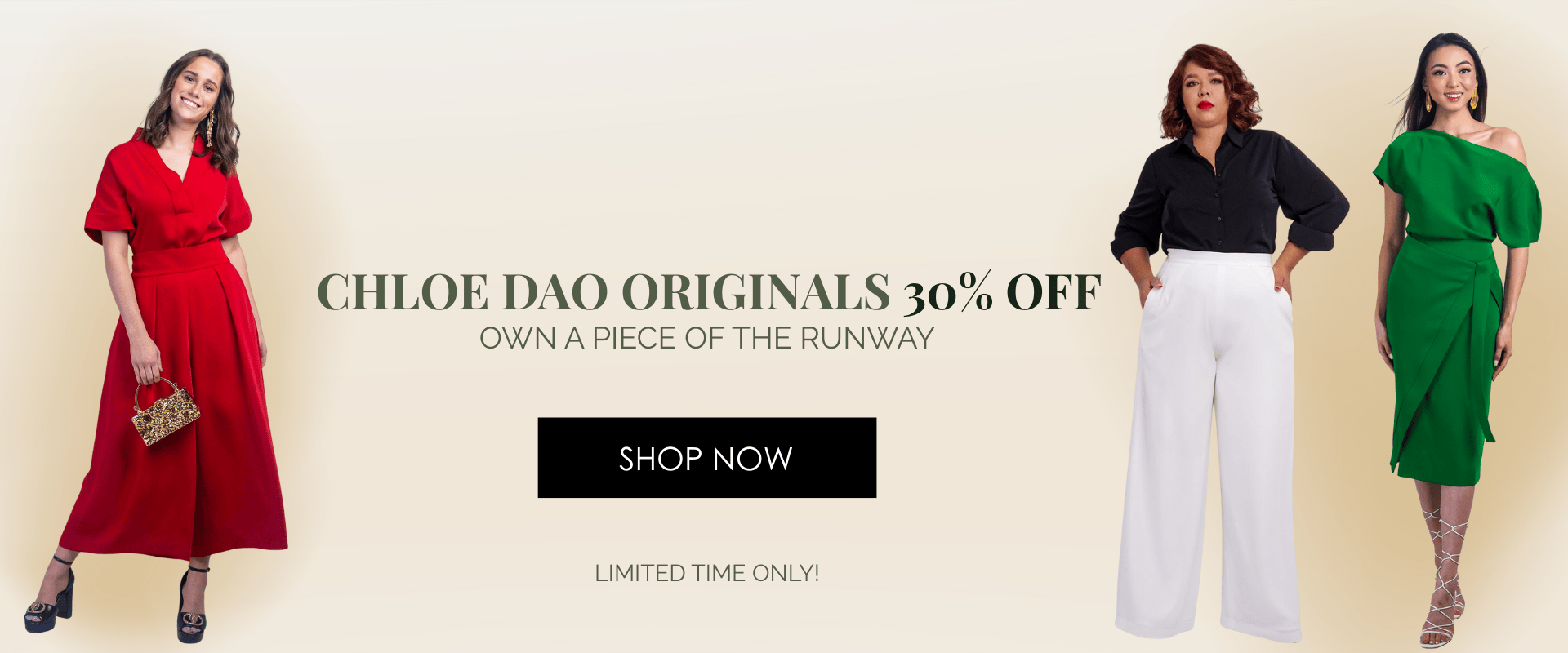 You’ve found your perfect Chloe Dao ready-to-wear piece, but you’d prefer it in a different color. Select your garment, color and size for a made to order item.